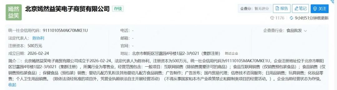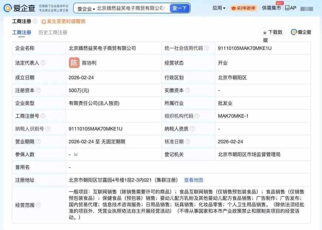 爱企查显示,由其间接全资持股的“北京嫣然益笑电子商贸有限公司”正式注册成立,法定代表人陈协利,注册资本500万元,经营范围锁定互联网销售和婴幼儿配方食品。