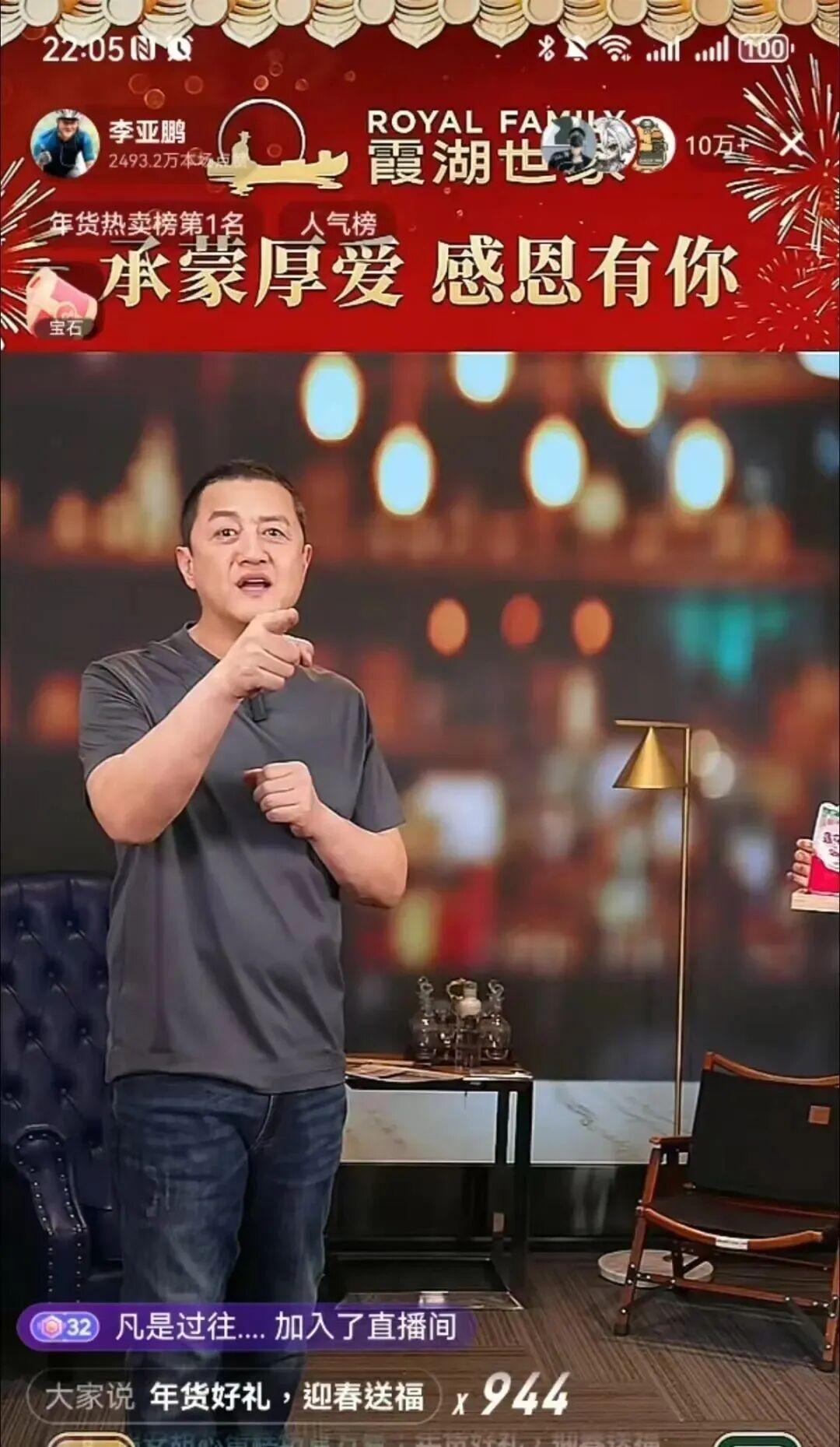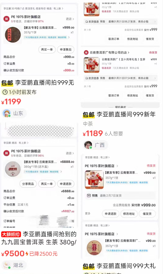 就在医院陷入困境之际,李亚鹏的直播带货突然爆发。1月23日“年货茶礼”专场,场观2418万、销售额近亿、单日涨粉73.7万,6888元普洱茶饼被抢到断货。